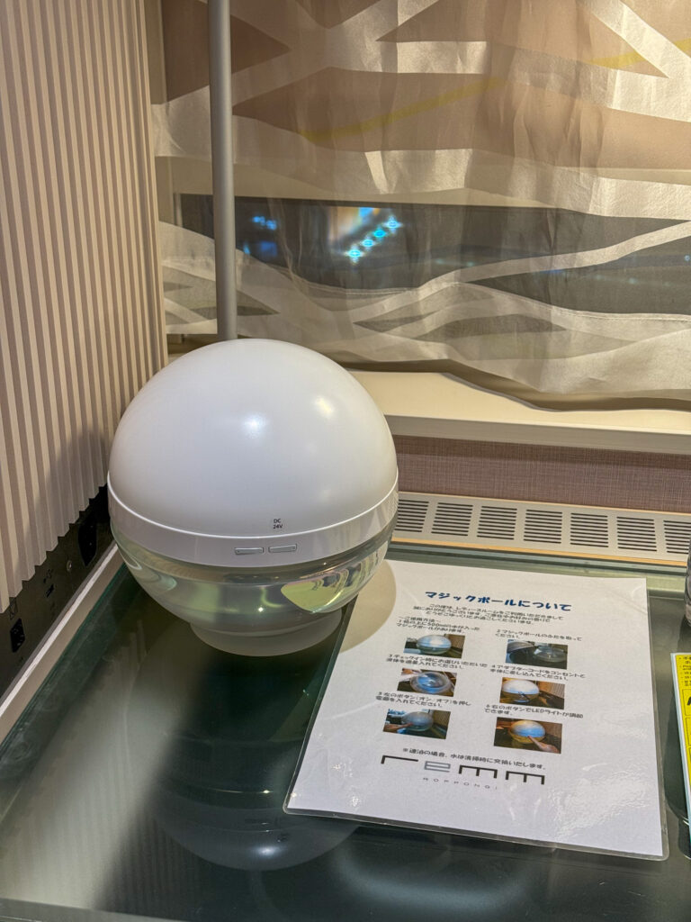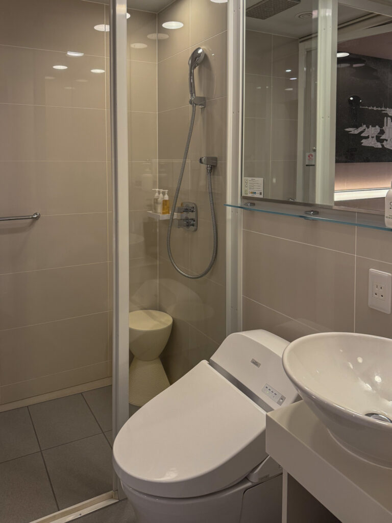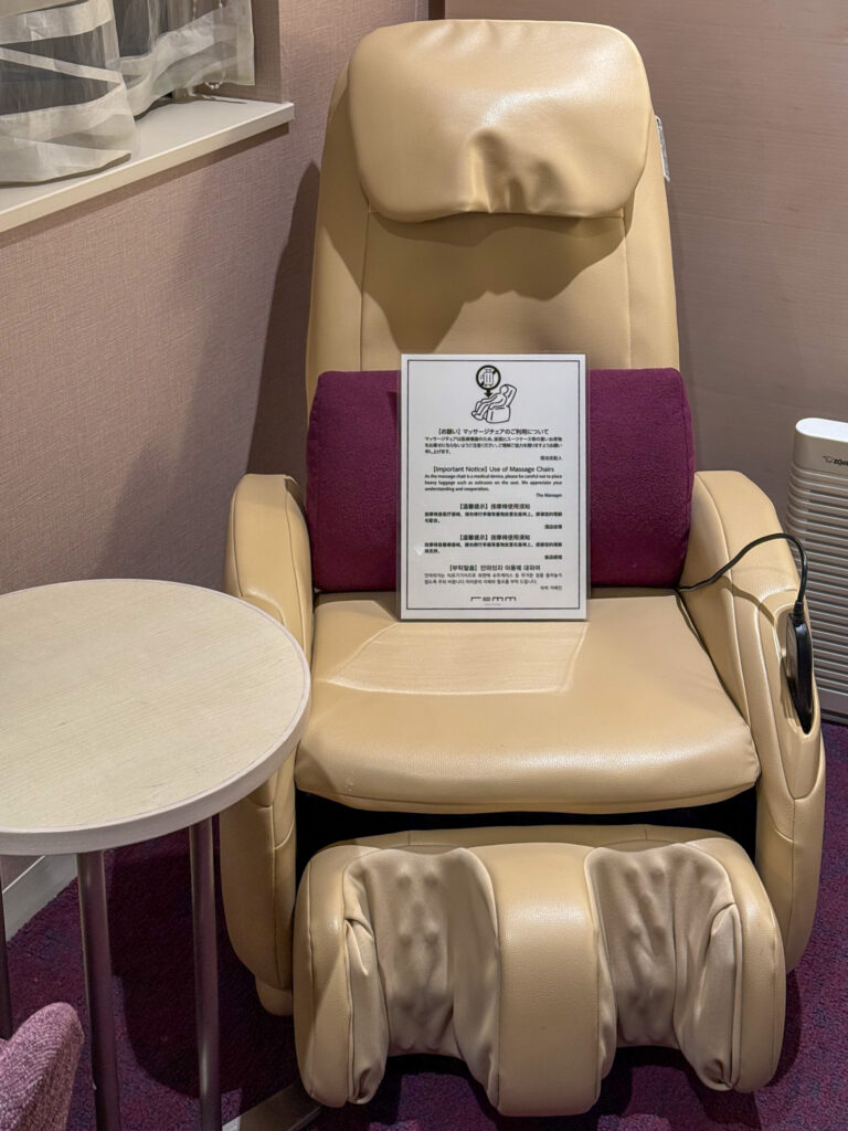浴槽はなくシャワーのみですが、水圧・空間設計が快適で、展示巡りの後にさっとリフレッシュできます。 - マッサージチェア付きが嬉しいポイント